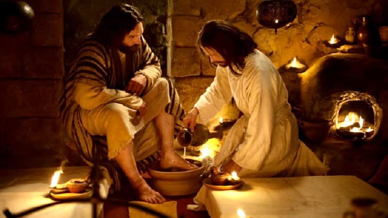 „Исус стана от вечерята, сложи мантията Си, взе престилка и се препаса. После наля вода в умивалника и почна да мие нозете на учениците и да ги изтрива с престилката, с която бе препасан.