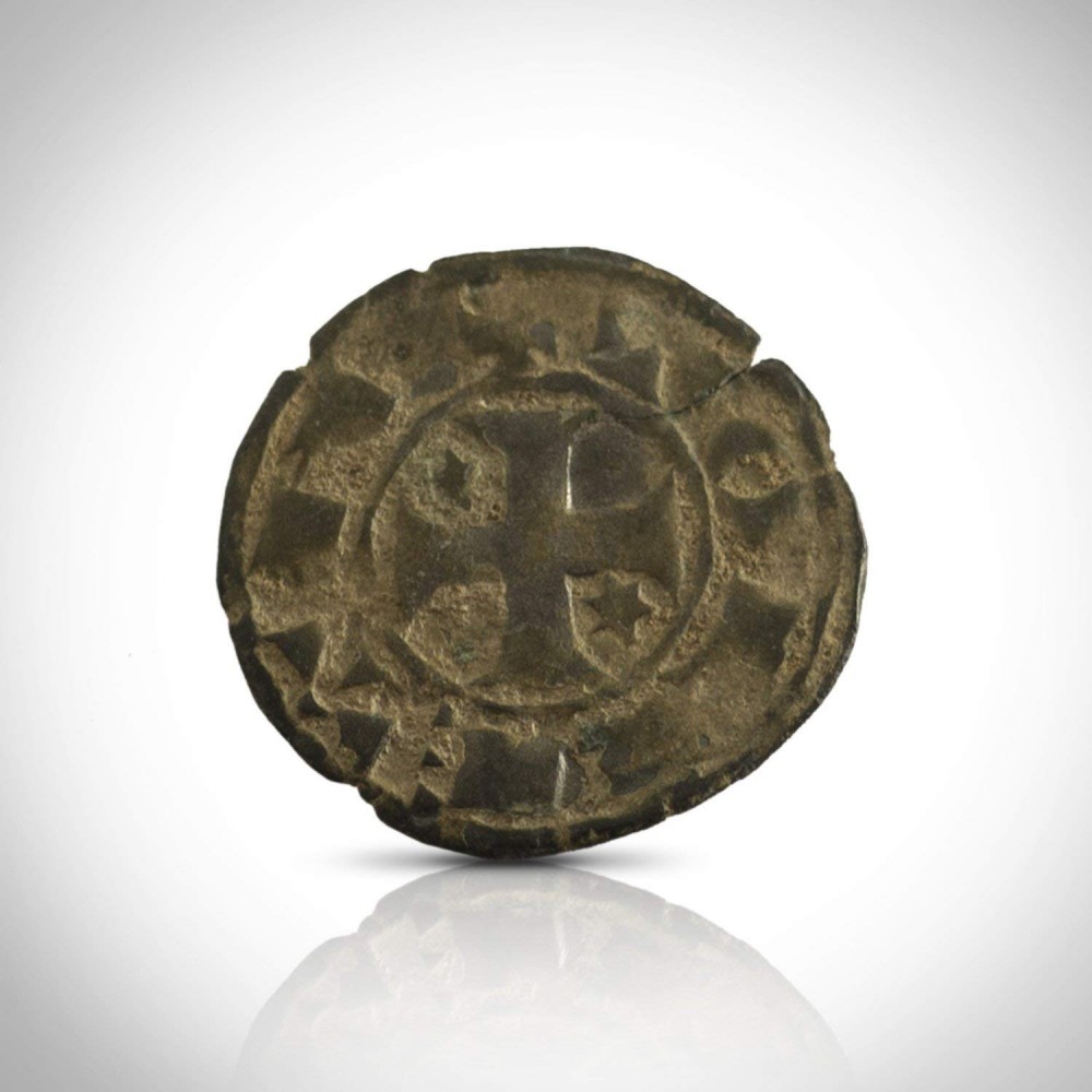 Тази монета, сечена за кратко между 1251 и 1257 г. във Франкиш Акър, отразява дизайна на половин драхма от Дамаск.